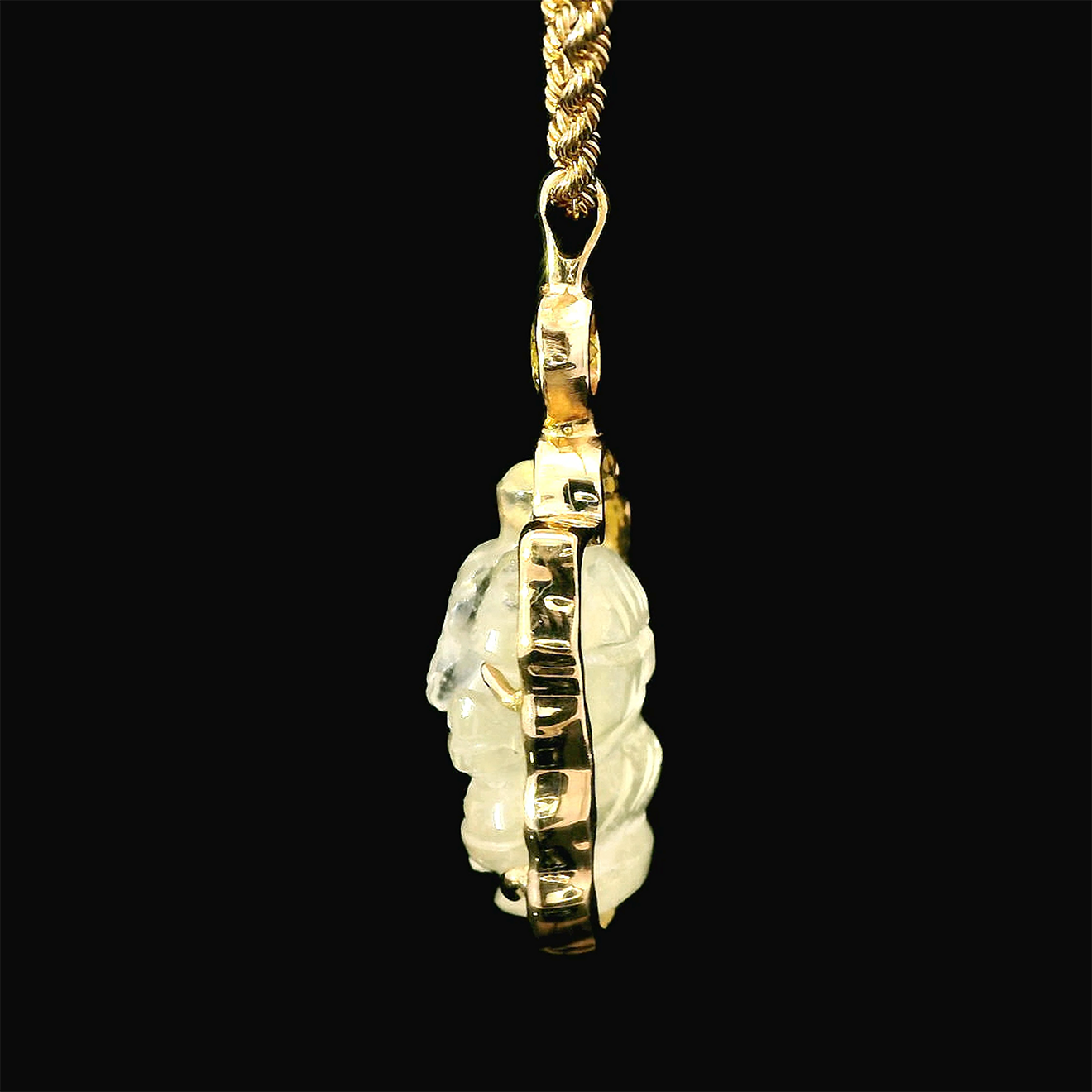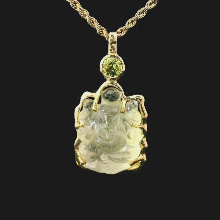 - 3.25 gram Libyan Desert Glass Ganesha carving set in a 14K gold frame pendant setting